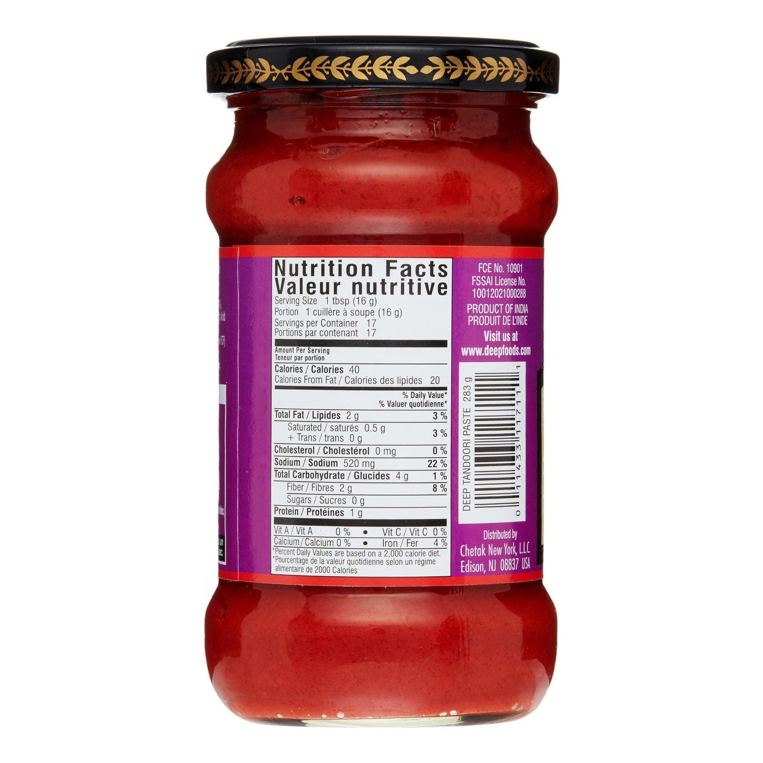Deep's Tandoori paste is a highly seasoned cooking paste, flavored with tamarind, ginger, coriander, cumin, and turmeric. Used to make the signature north Indian dish, tandoori chicken, this cooking paste has a rich flavor and vibrant red coloring.