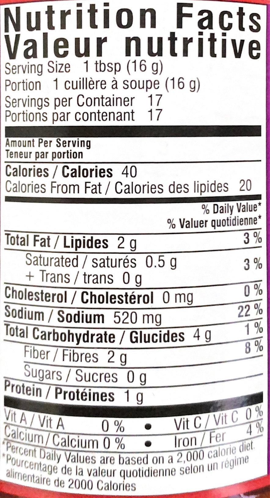 Ingredients: Garlic (65%), Corn Oil, Tamrind (10%), Salt (8%), Coriander, Cumin, Ginger, Lentils, Red Chili Powder, Citric Acid, Turmeric, Acetic Acid, Sodium Benzoate (E211), Colors: F.D.&C Red No. 3 (Erythrosine), F.D.&C. Yellow No. 6. (Sunset Yellow FCF).