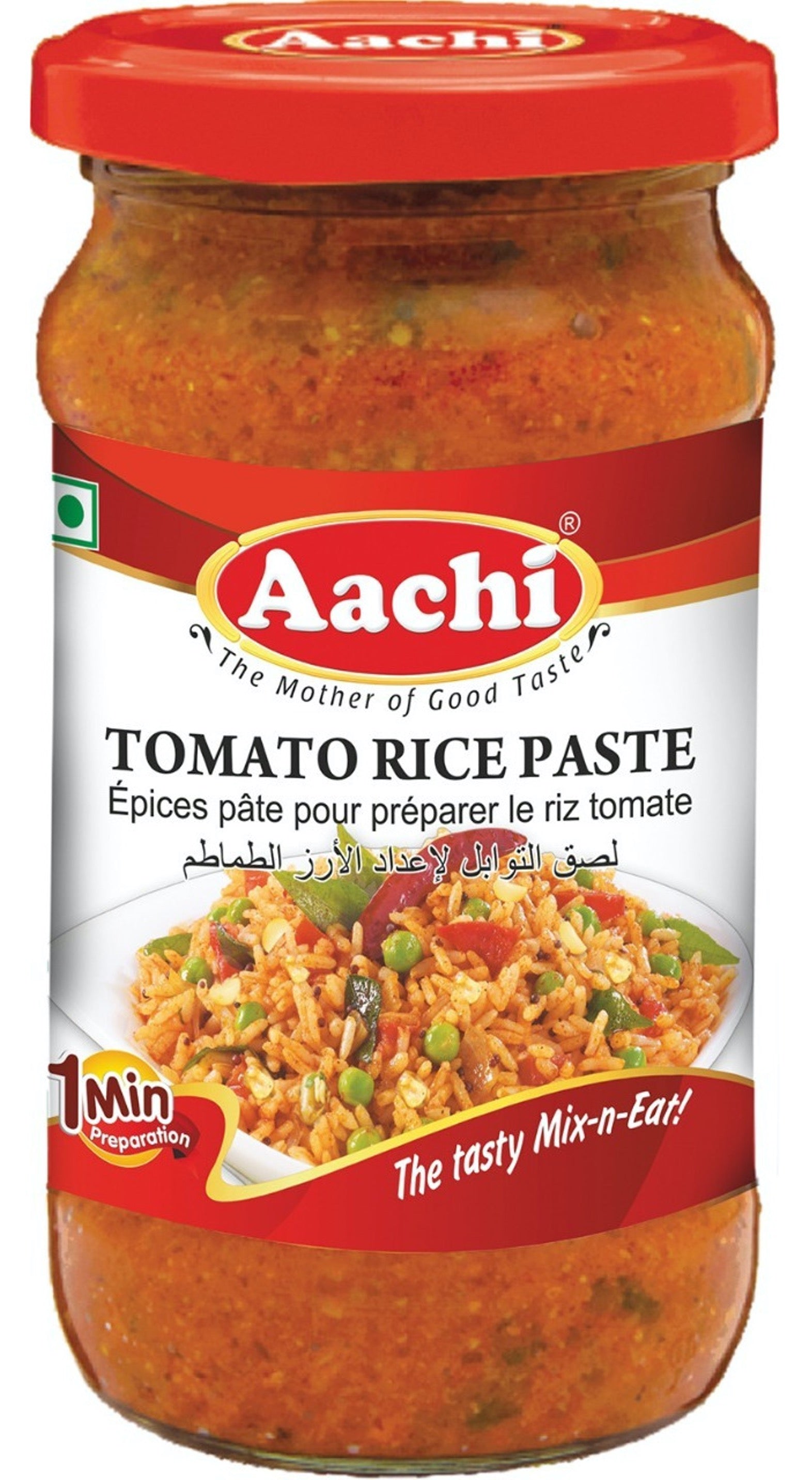 Mix 3-4 tbsp of Tomato rice paste to 400-450g of cooked rice. Garnish with coriander leaves and serve. It may also be used as a side dish for Idly, Dosa, Chappathi and poori. Ingredients: Tomato, Onion, Edible Vegetable Oil-Refined Sunflower Oil, Garlic, Salt, Tamarind, Ginger, Coriander, Red Chilli Powder, Mustard, Jaggery, Compounded Asafoetida and Acidity Regulator. Allergen Advice: Contain Mustard. &May Contain Gluten Soya, Tree Nuts, Peanuts, Sesame, Milk Products .