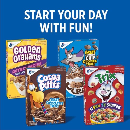 Trix breakfast cereal brings fun and flavor to your family's morning! Six colorful, fruit-shaped cereal pieces burst with fruity flavor kids love, making it an easy kidâs breakfast idea. It's also a cereal you can feel good about sharing with your family. Trix cereal is made with whole grains (14g whole grain per serving; at least 48g recommended daily) and vitamins and minerals. What a great way for your family to start their day.A quick and easy breakfast win for kids, Trix also makes for a tasty after school or bedtime snack. Pour a handful into a sandwich bag to take with you when you're on-the-go or on your next family adventure. Use the cereal pieces for your next creative baking project (cereal bars anyone?) or keep a box on hand for the next time you host a kidâs sleepover and want a morning meal everyone will enjoy.