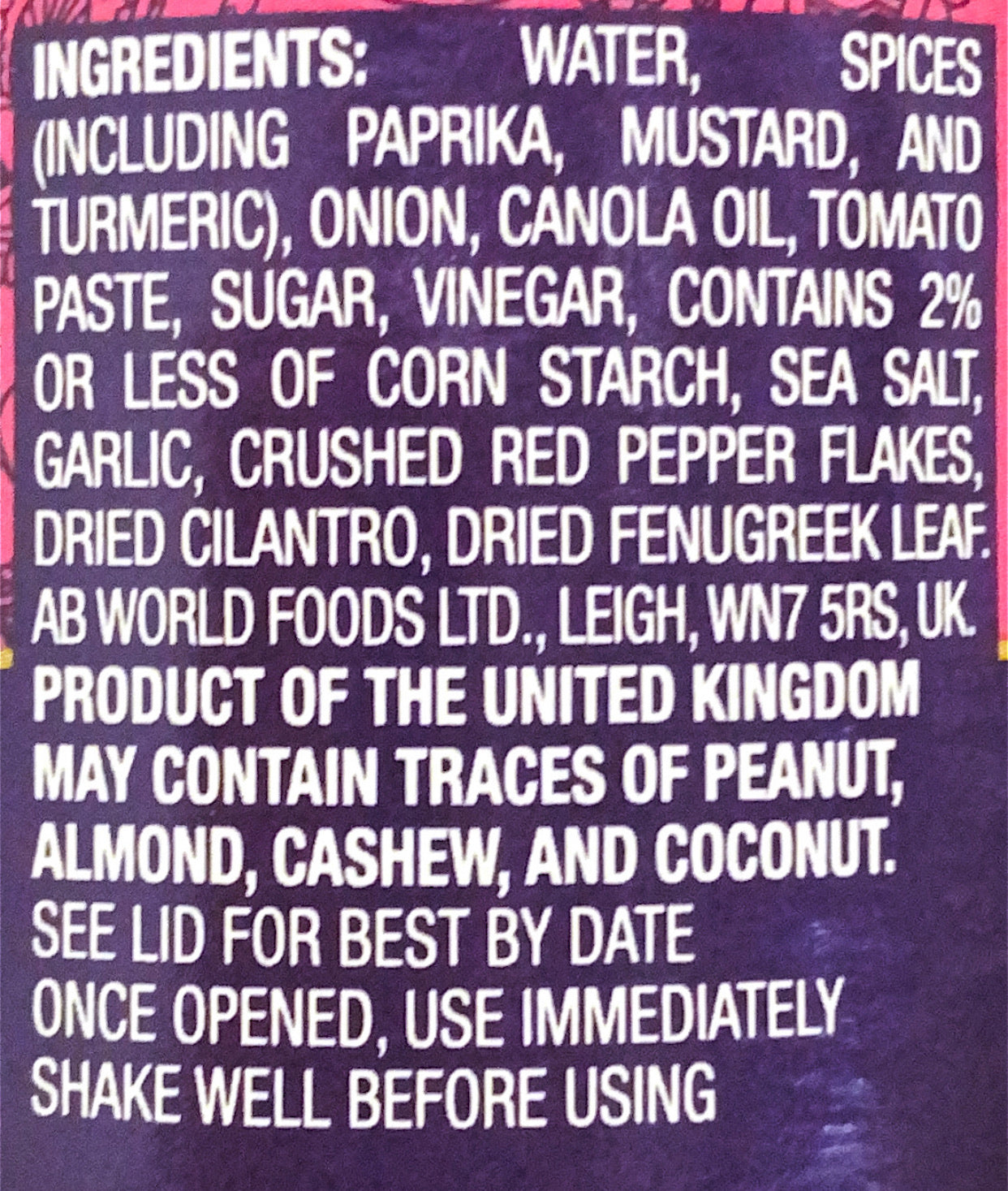 INGREDIENTS: WATER, SPICES (INCLUDING PAPRIKA, MUSTARD, AND TURMERIC), ONION, CANOLA OIL, TOMATO PASTE, SUGAR, VINEGAR, CONTAINS 2% OR LESS OF CORN STARCH, SEA SALT, GARLIC, CRUSHED RED PEPPER FLAKES, DRIED CILANTRO, DRIED FENUGREEK LEAF.